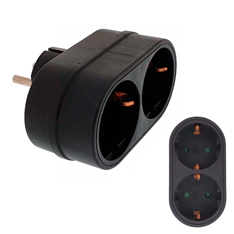Adaptador eléctrico 2 salidas Schuko (1 macho posición horizontal a 2 hembras) 16A 250V AC 3680W max. EuroBric 51322 en color negro, con protección para niños.