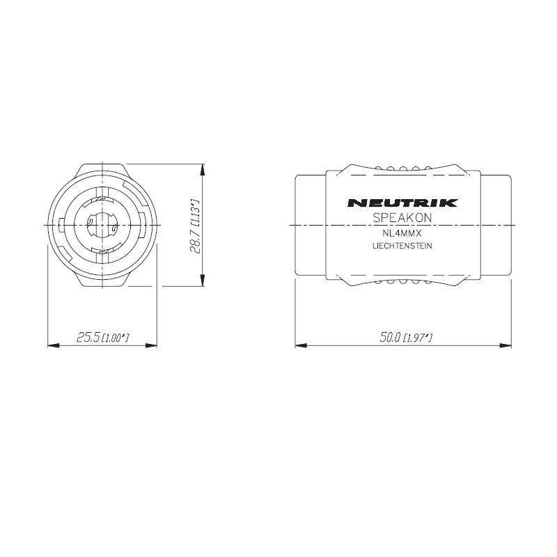 Adaptador SpeakON de 4 polos macho – macho Neutrik NL4MMX carcasa de Poliamida (PA6) negro, con sistema de cierre de bloqueo.
