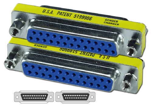 Adaptador Sub-D 25 pines mini, hembra-hembra, configuración pin to pin.