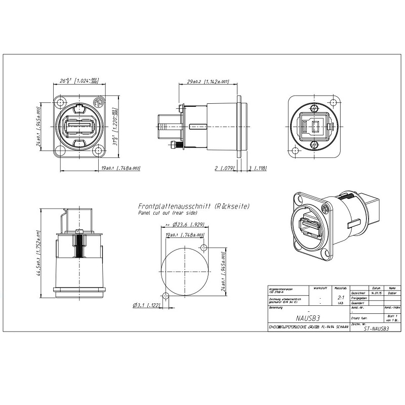 Adaptador USB 3.0 reversible (Tipo A y B) Neutrik NAUSB3-B carcasa negra D para panel