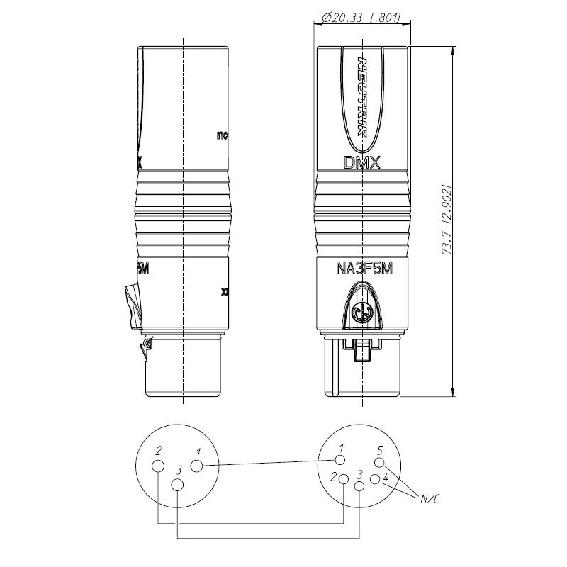 Adaptador XLR 3 pines hembra a XLR 5 pines macho NEUTRIK NA3F5M con carcasa robusta, para aplicaciones de iluminación (DMX)