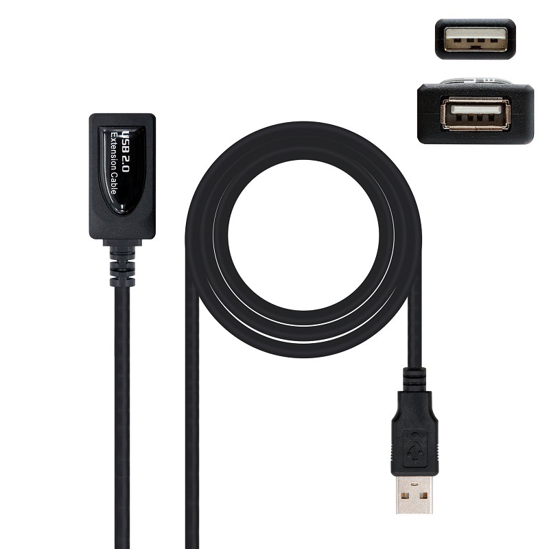 Cable USB 2.0 prolongador con amplificador, Tipo-A macho – hembra NANOCABLE 10.01.0212 en color negro, 10 metros