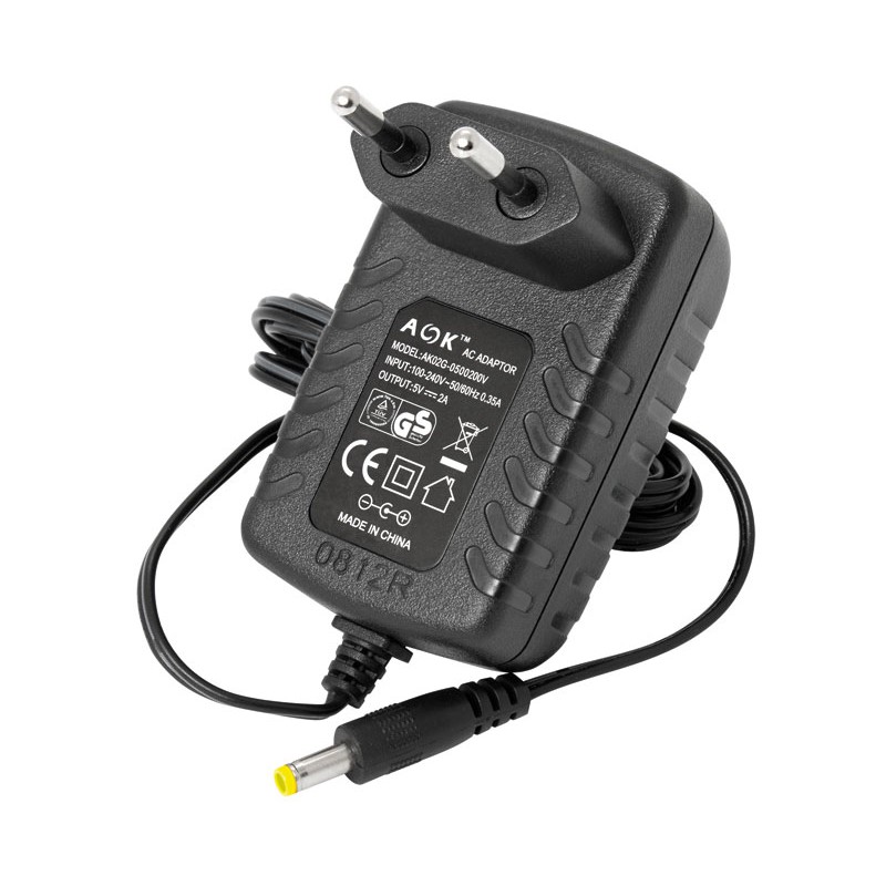 Alimentador electrónico universal 5Vdc 2A AOK AK02G con clavija de 5,5mm x 2,1mm x 15mm.