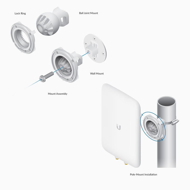 La UMA-D es una antena de doble banda y doble polaridad optimizada para 802.11ac. Ofrece un patrón de radiación direccional y una montura de rótula de tres ejes para apuntar con precisión.