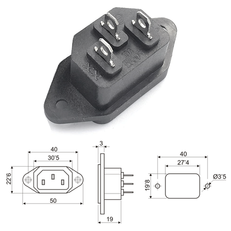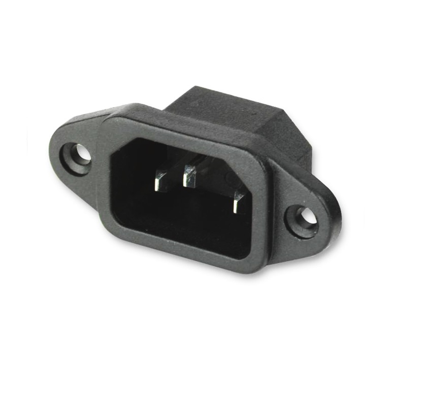 Base de conexión IEC 320 C14 macho 10A/250V con fijación a panel por tornillo y terminales faston de 4,8mm.