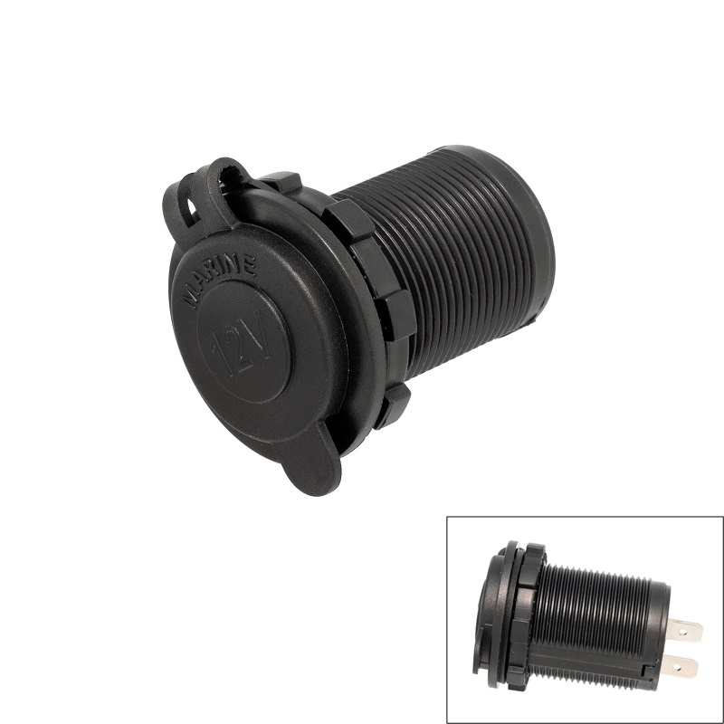Base conector de mechero de auto hembra 12V 10A para roscar en panel, carcasa de plástico con tapa protectora en color negro.