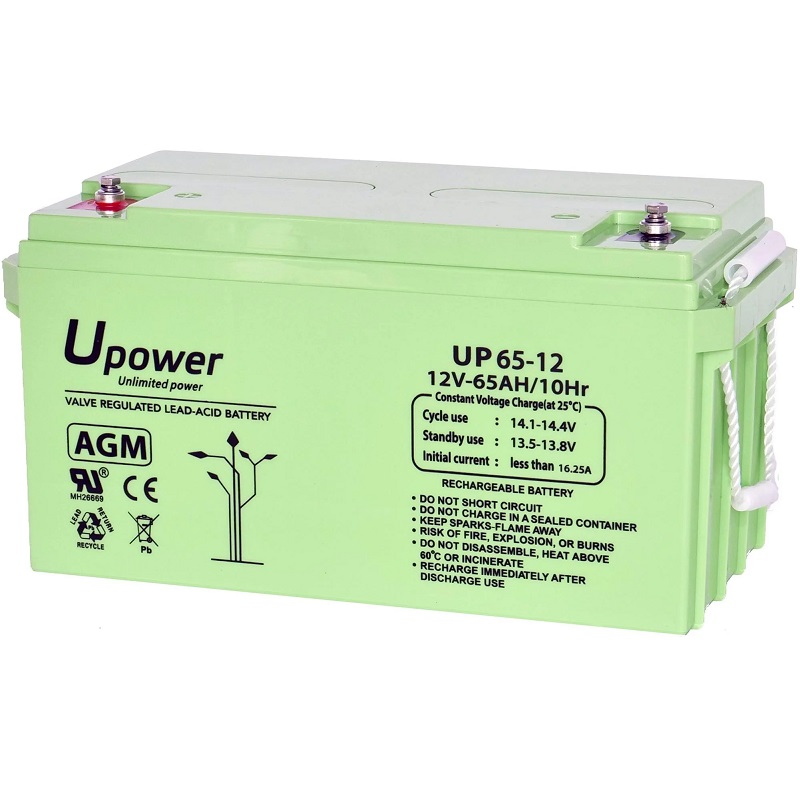Batería de Plomo Ácido alta descarga 12 Voltios 65 Amperios, fabricada con tecnología AGM. Dimensiones: 348x167x178mm