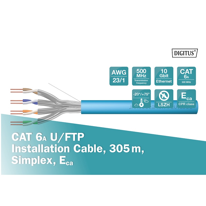 DIGITUS Cable de instalación de par trenzado CAT 6A U-FTP 500 MHz Eca (EN 50575), AWG 23/1, azul, bobina de 305 m. Optimiza el rendimiento y la calidad de las conexiones de su red.