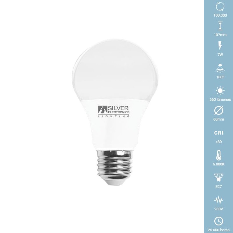Bombilla LED estándar E27 660Lm 220V 7W 6000K (Blanco frio) 180º 25.000h Silver Electronics 981727 acabado en color blanco