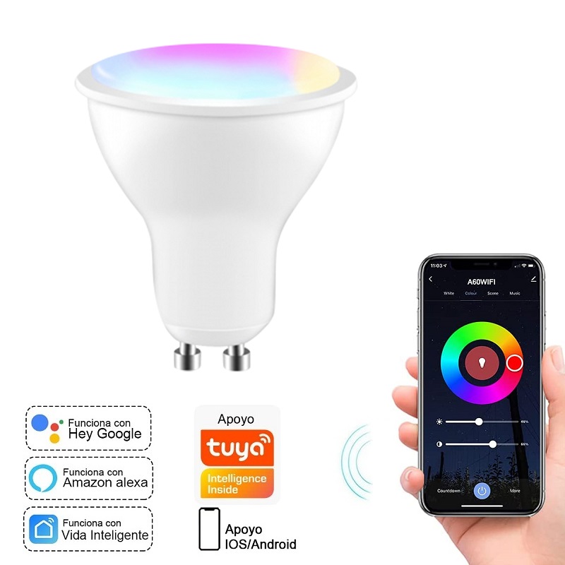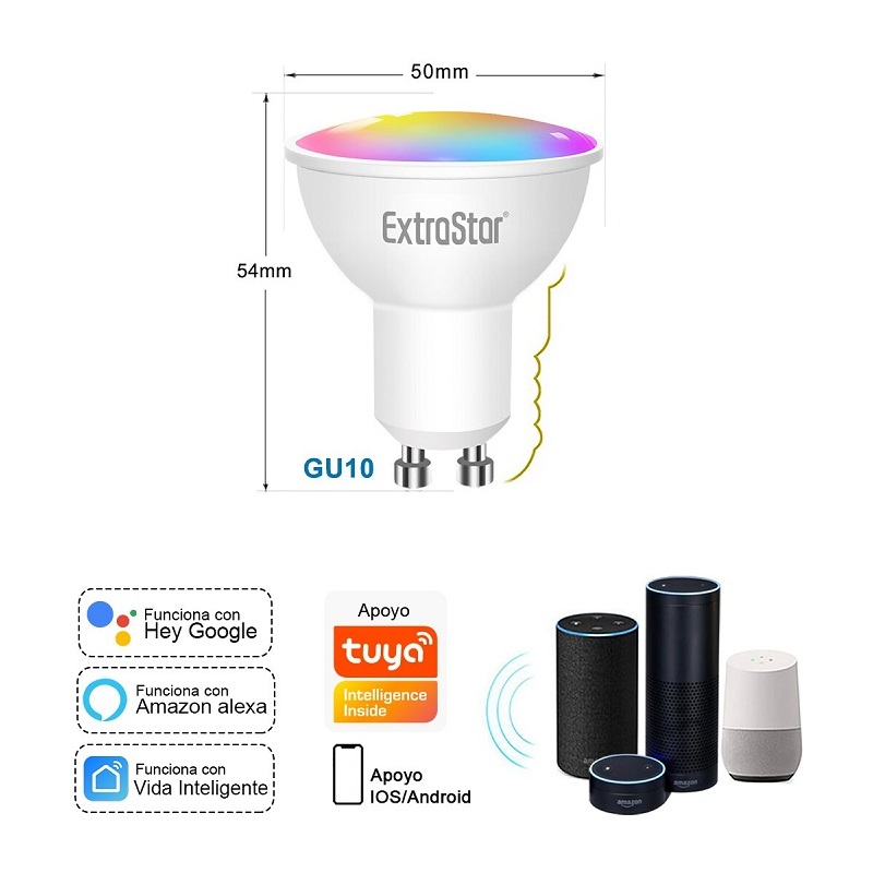 Bombilla LED RGB WiFi GU10 480LM 6W 220VAC ExtraStar CJ144 regulable compatible con Hey Google, Amazon Alexa, Tuya, Smart life