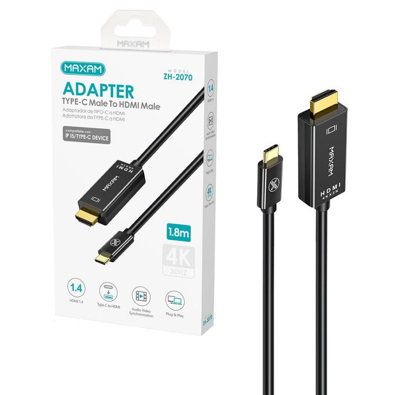 Cable conexión USB-C macho a HDMI macho 1.4v 4K30Hz Maxam ZH-2070 en color negro, cable de 1.8 metros