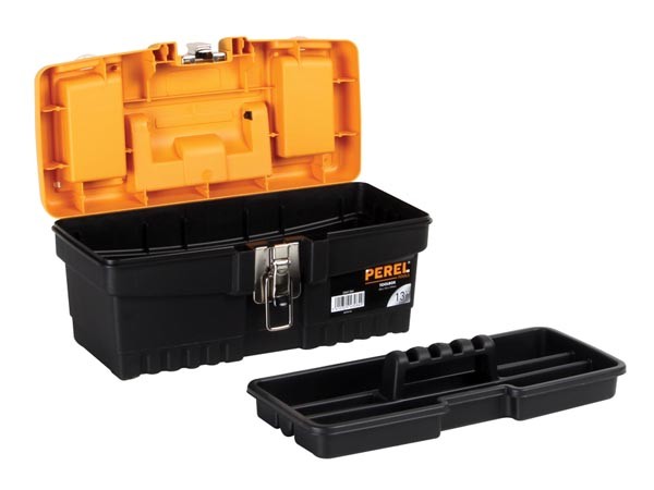 Caja de herramientas de plástico 13″ Perel OM13M de alta resistencia con bandeja desmontable, compartimentos en tapa y cerradura metálica.