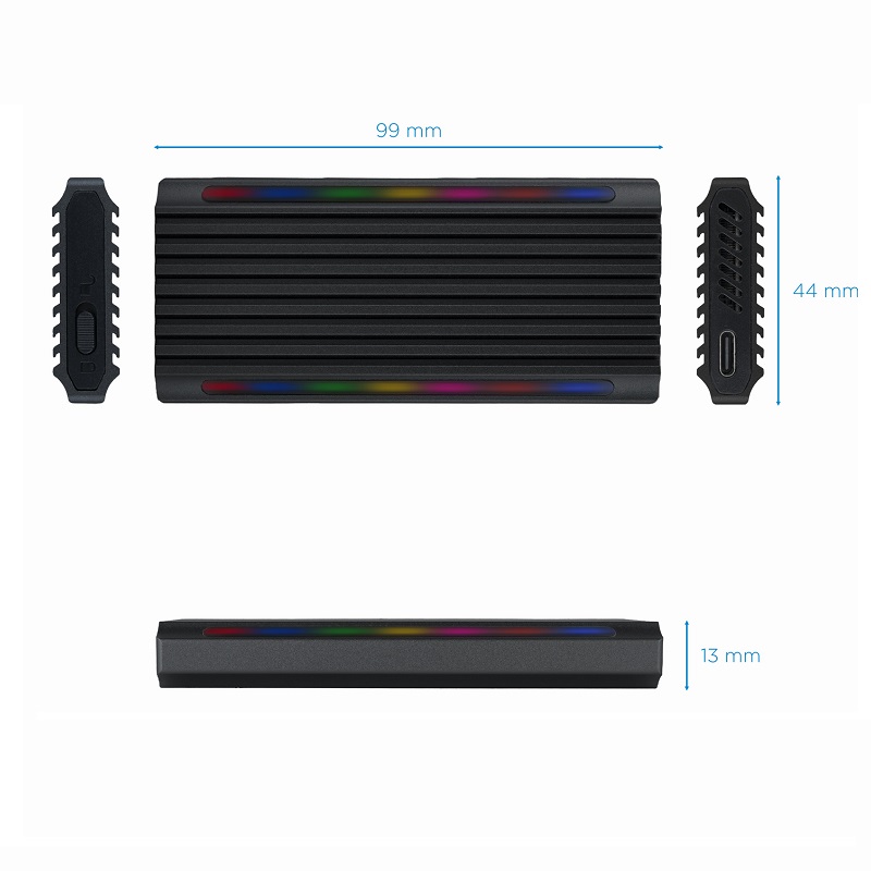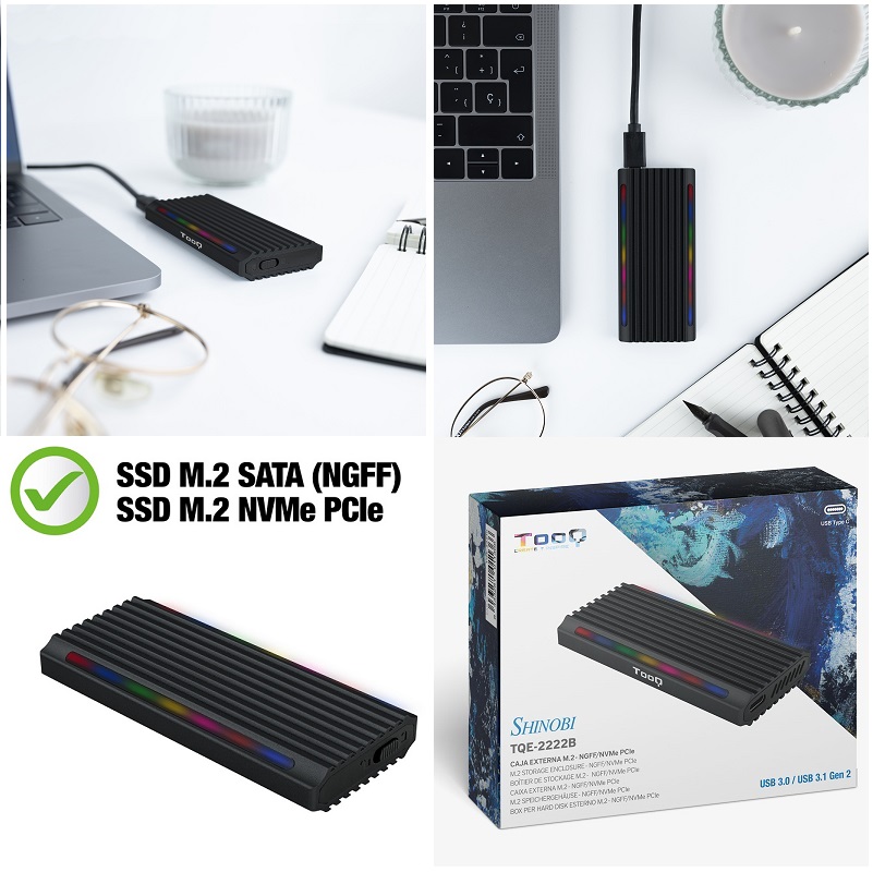 Caja Externa para SSD M.2 NGFF/NVMe TOOQ TQE-2222B “SHINOBI”, USB3.1 GEN2 USB-C RGB, Negro