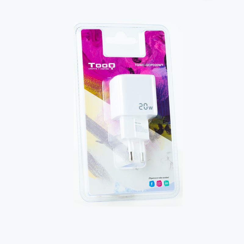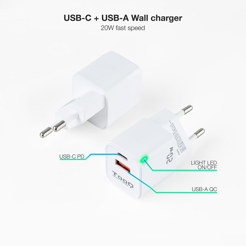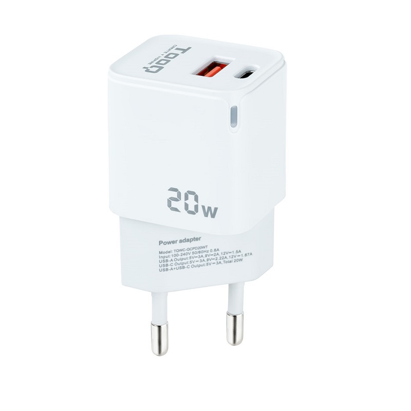 Cargador de Pared USB-C PD + USB-A QC 20W TOOQ TQWC-QCPD20WT en color blanco