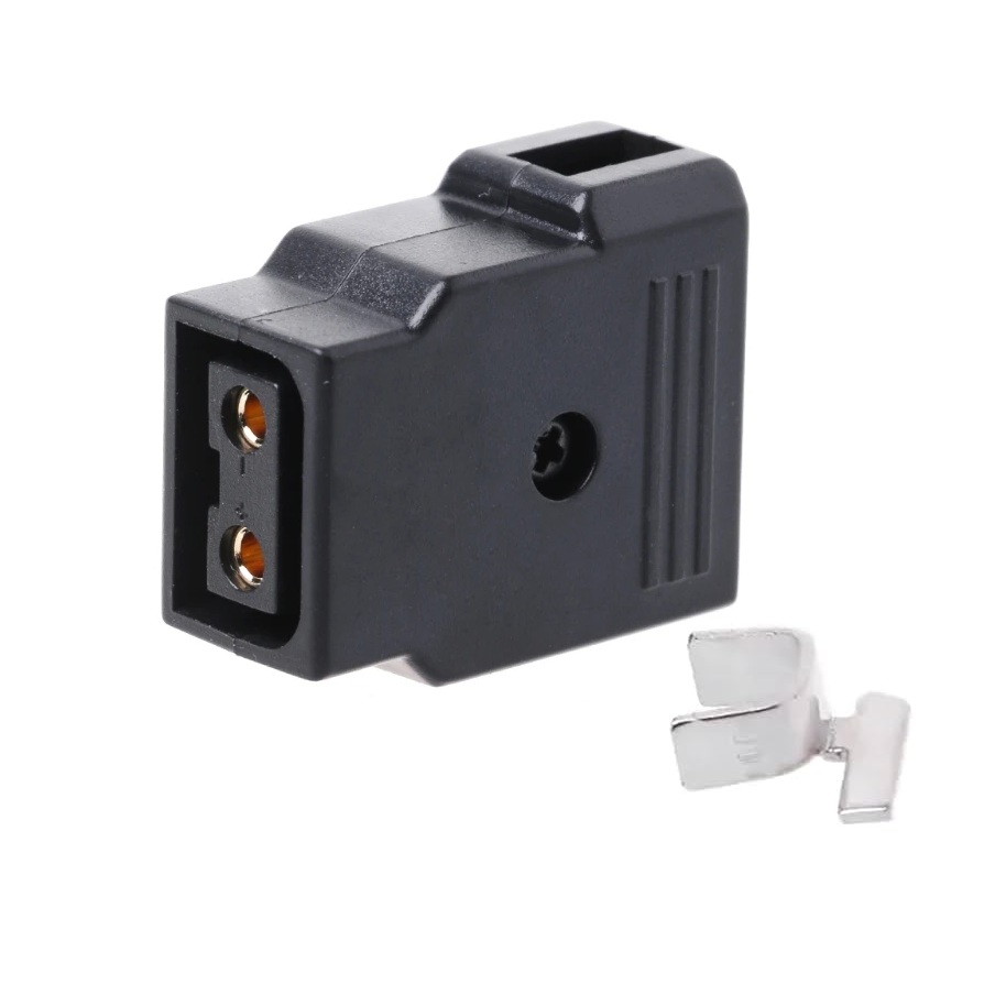 Conector profesional de alta potencia D-Tap de 2 pines hembra aéreo, para uso en baterías o cámaras ENG, acabado en plástico ABS de color negro.