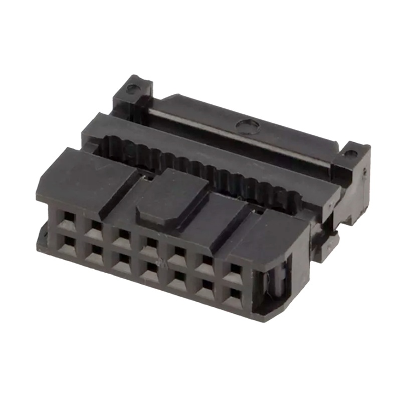 Conector IDC 14 pines (2 líneas x 7 pines) hembra, raster contactos 2.54mm, para crimpar en cinta plana raster 1.27mm