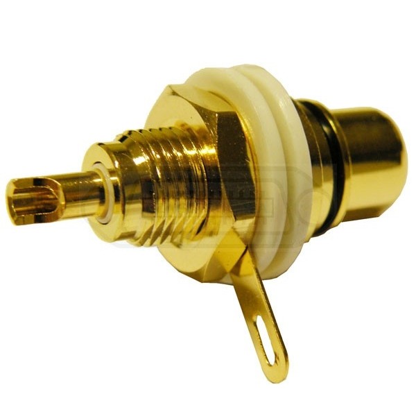 Conector RCA hembra metálico dorado de soldar para chasis con aislamiento y anillo de indentificación en color negro.