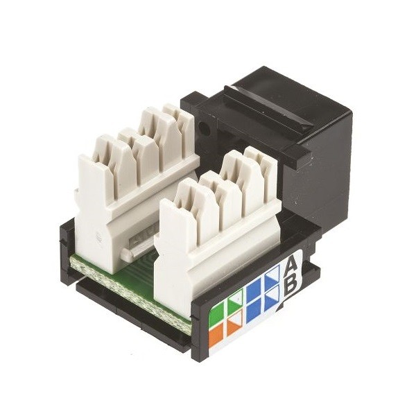 Los conectores hembra modulares RJ45 AMP cumplen con la categoría 5 y 5e conforme a los requisitos EIA/TIA 568. Los conectores hembra encajan de manera sencilla en la roseta o panel. Cada conector hembra tiene bloques perforados de estilo 110 con código de color para una terminación sencilla. Con cableado a 568A y 568B según se especifica.