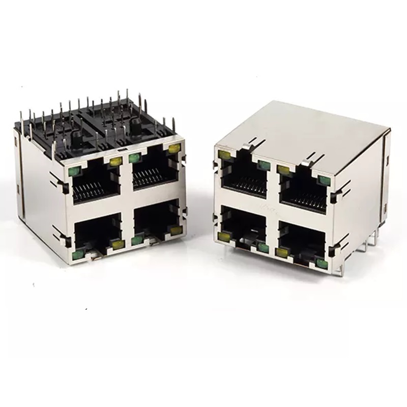 Conector modular RJ45 hembra 4 puertos 8P8C zocalo blindado acodado para soldar en circuito impreso, con indicador led.