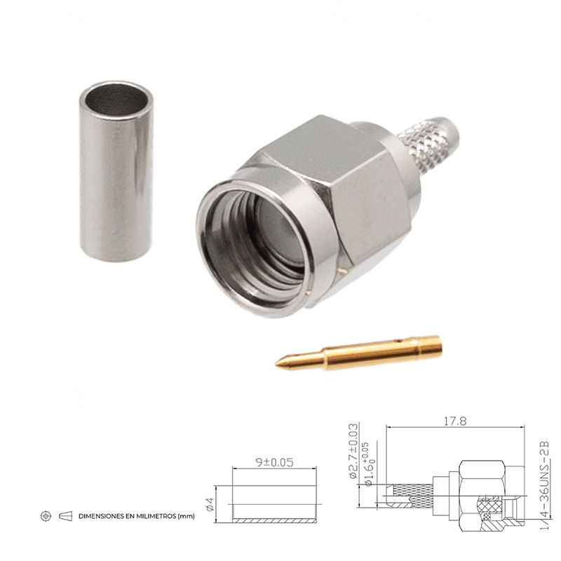 Conector coaxial SMA macho 50Ω aéreo recto dorado para crimpar en cable RG174 / LMR100
