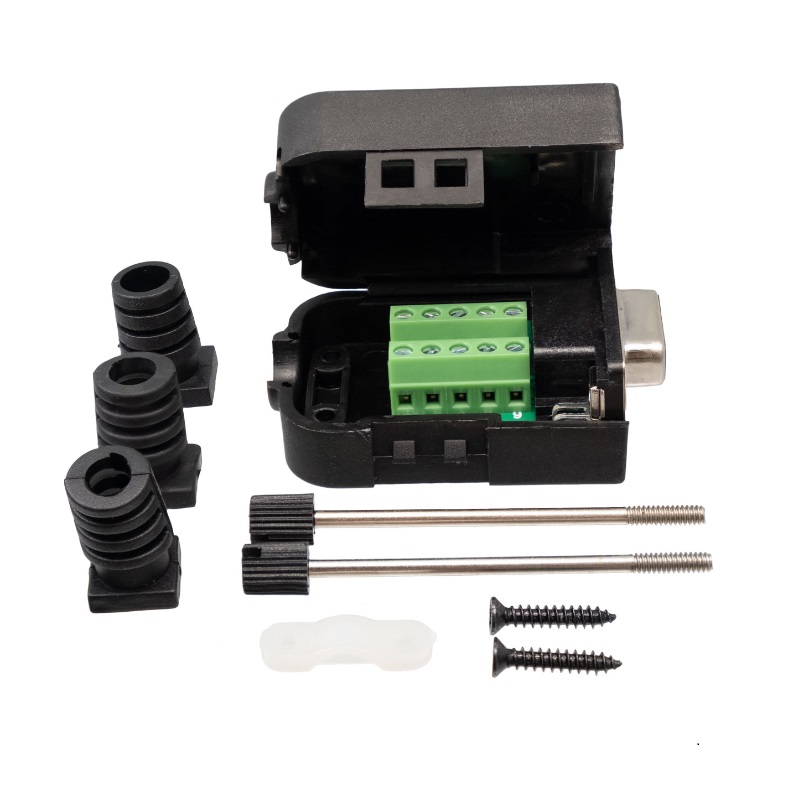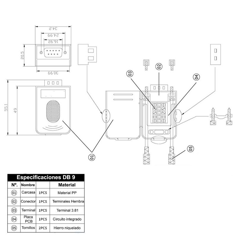 Conector DB9 con terminales, permite hacer la conexión manual de cable y conector.