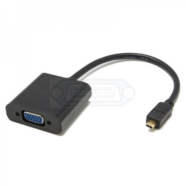 Conversor de Vídeo Micro HDMI macho a salida VGA hembra con cable en color negro.