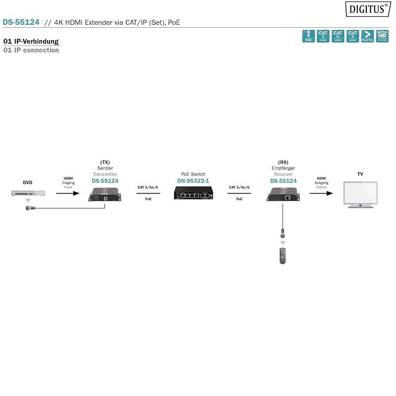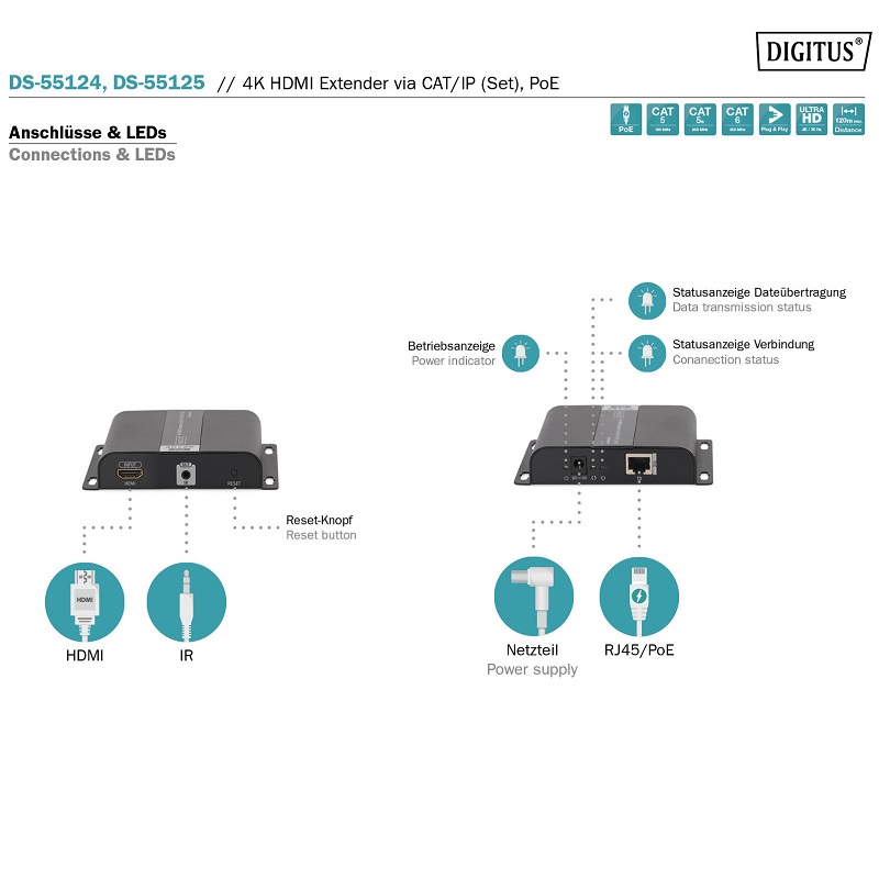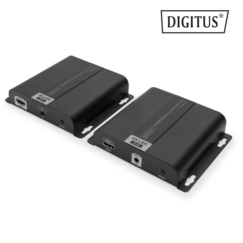 Extensor HDMI 4K vía CAT/IP (set) PoE DIGITUS DS-55124 Transmisor y receptor de señales AV, 3840 x 2160 Pixeles, señal hasta 120 metros, color negro