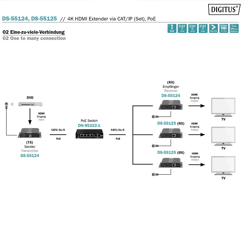 El set de extensión HDMI 4K (DS-55124) consiste en una unidad de transmisión y recepción. Ambos se gestionan sin fuentes de alimentación externas, la alimentación se asegura mediante un conmutador PoE adicional. Cuando se usan conmutadores POE adicionales o la infraestructura existente, la señal HDMI se puede extender a una distancia limitada (conexión IP). Las unidades receptoras adicionales (DS-55125) permiten que su contenido de vídeo se distribuya en hasta 253 pantallas utilizando su infraestructura de red existente o conmutadores PoE adicionales (conexión punto a multipunto). Con una simple conexión punto a punto, su contenido de vídeo 4K puede verse a una distancia de hasta 120 metros. Coloque sus pantallas, TV fácilmente en cualquier lugar, independientemente de la fuente.