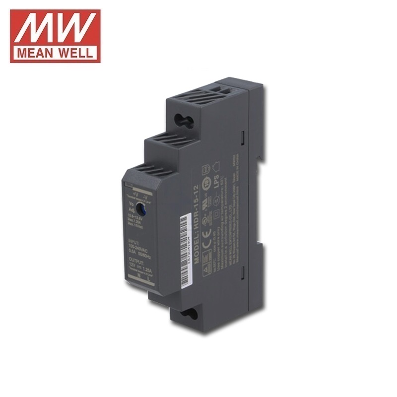 Fuente de alimentación conmutada AC Mean Well HDR-15-12 de 1 salida DC 12V, 1.25 A, 15W, para montaje en carril din con el accesorio KDIN