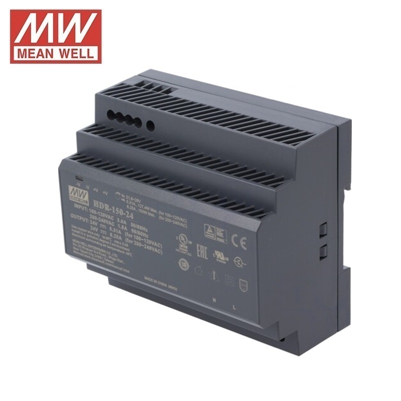 Fuente de alimentación conmutada AC Mean Well HDR-150-24 de 1 salida DC 24V, 6.25A, 150W, para montaje en carril din con el accesorio KDIN