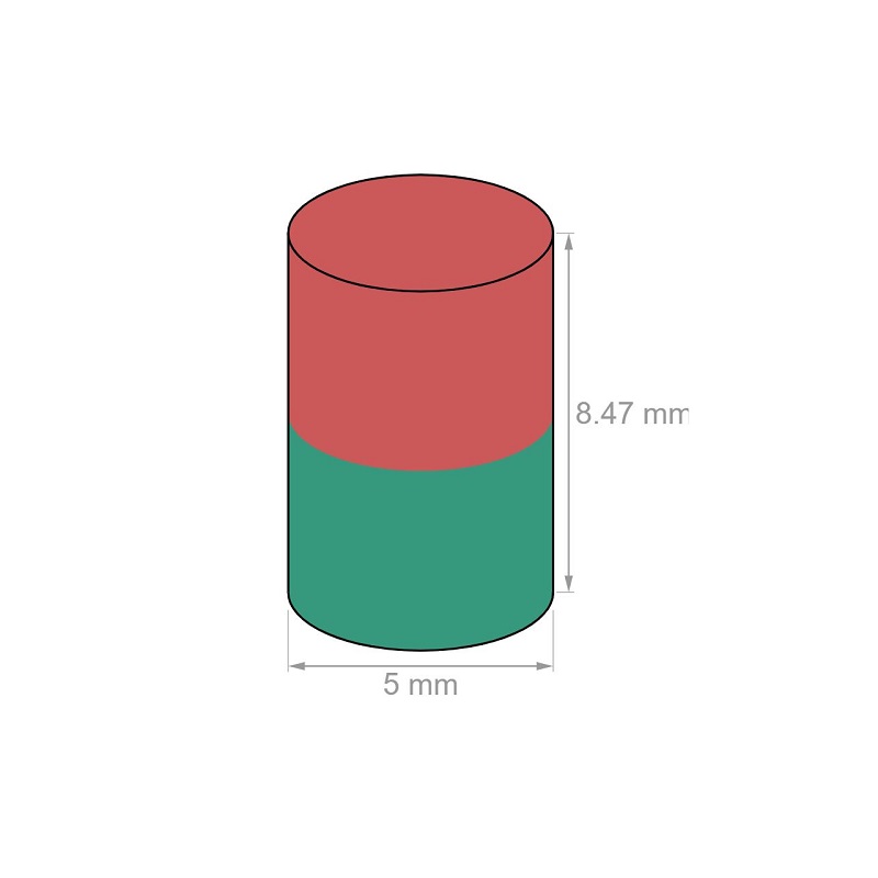 Cilindro magnético de neodimio N45 niquelado Ø 5 mm, 8,47 mm de alto, sujeta aprox. 1,1 kg.
