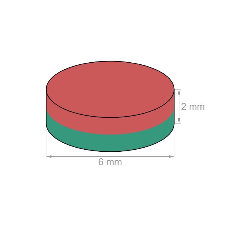 Disco magnético de neodimio N45 niquelado Ø 6 mm, 2 mm de alto, sujeta aprox. 740 g.