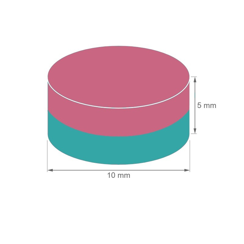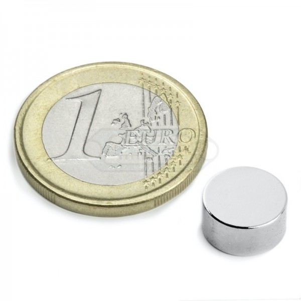 Disco magnético de neodimio N42 niquelado Ø 10 mm, 5 mm de alto, sujeta aprox. 2,6 kg.