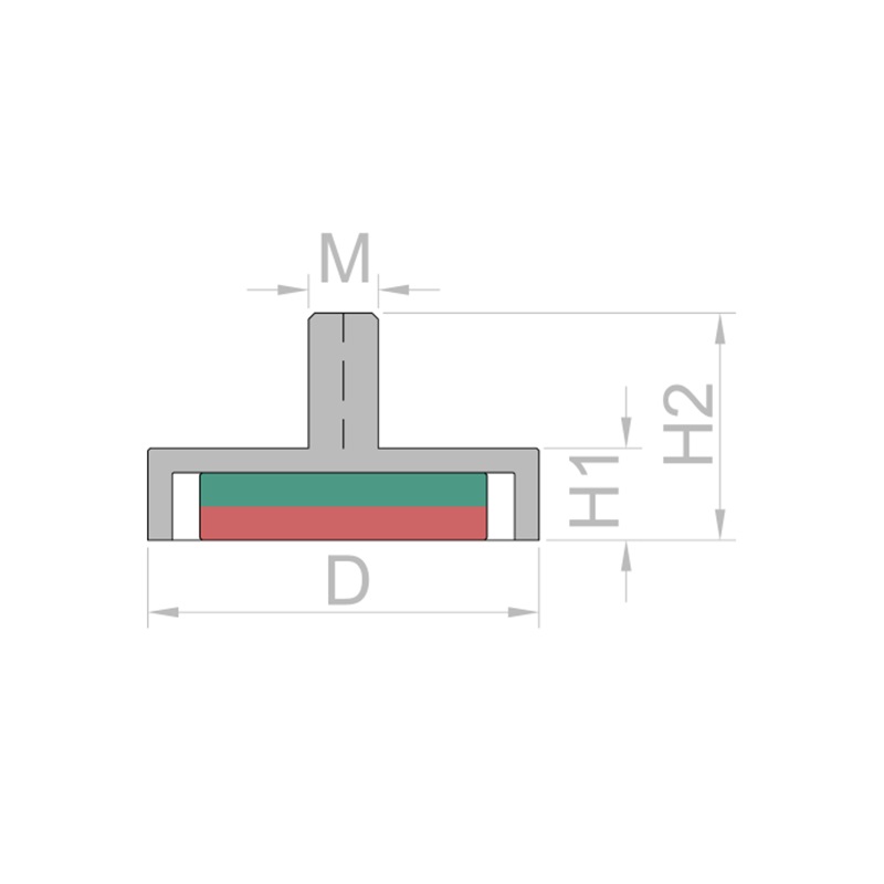 Este imán en recipiente con un diámetro de 16 mm cuenta con un vástago roscado. El vástago se puede introducir, p. ej., por un agujero y fijarlo con una tuerca. Este imán es muy apreciado para soluciones de iluminación, en el procesamiento del metal y en el equipamiento de cocinas y baños.