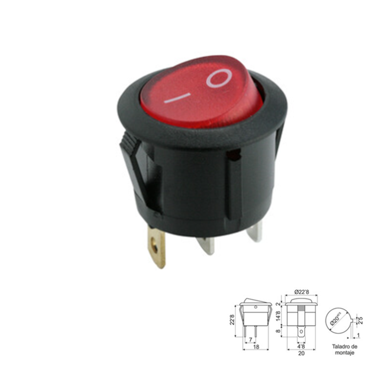Interruptor unipolar basculante luminoso rojo DC 12V On-Off 6A/250V redondo empotrable, 3 faston soldables, cuerpo negro, tecla en color rojo