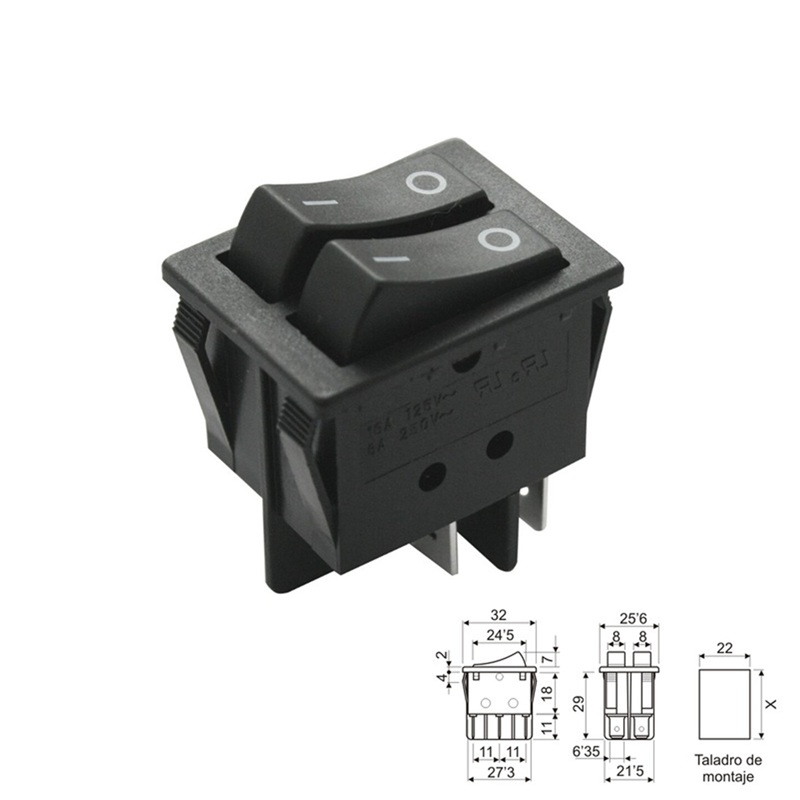 Interruptor basculante 2 posiciones (On-Off) doble 16A/250V, base rectangular negra con doble tecla negra serigrafiada (I/O), empotrable, sin luz.