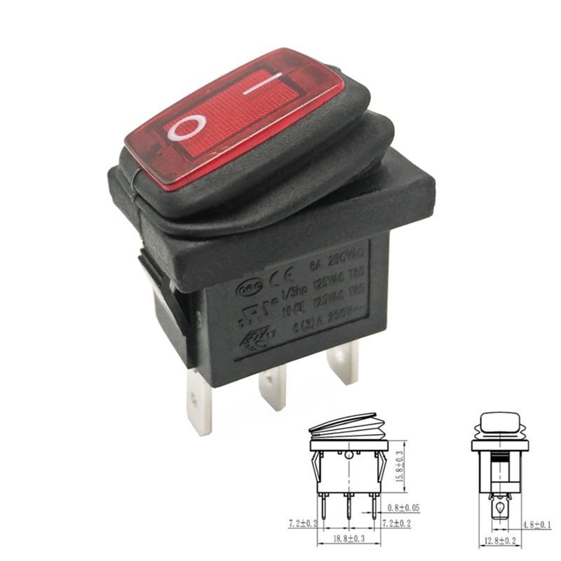 Interruptor luminoso estanco ON-OFF 6A/250V para panel, con 3 terminales faston, cuerpo negro/tecla roja.