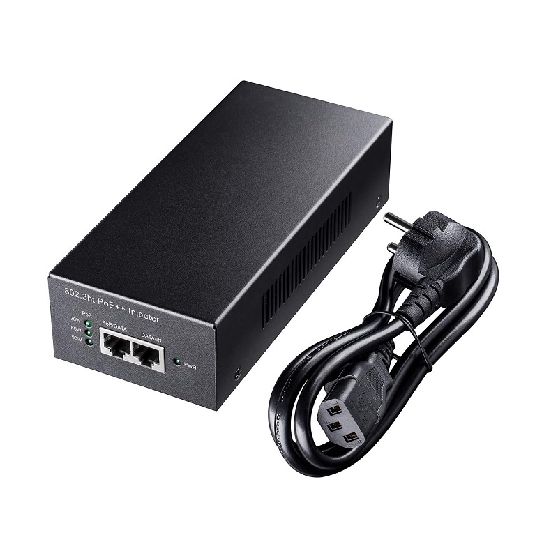 Un adaptador PoE con carcasa metálica montado en la pared que inyecta hasta 90W de potencia al cable Ethernet para encender el dispositivo PoE.