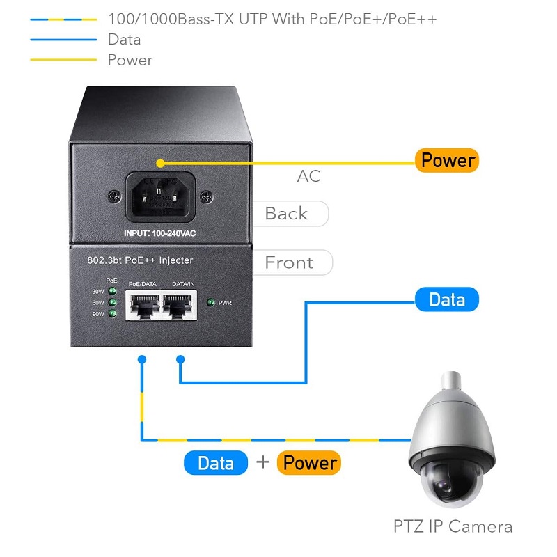 Con la tecnología de detección automática, este adaptador PoE entrega hasta 90W a un dispositivo PoE ++ con compatibilidad con versiones anteriores para dispositivos 802.3bt/at 4 pares (60w), 802.3at 2 pares (30w) PoE + y dispositivos 802.3af PoE (15.4W).