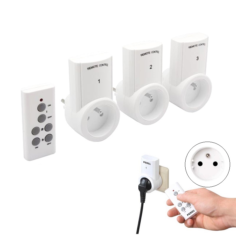 Juego de 3 enchufes inalámbricos Perel 7500-3N2 toma Schuko con toma de tierra con espiga y mando a distancia.