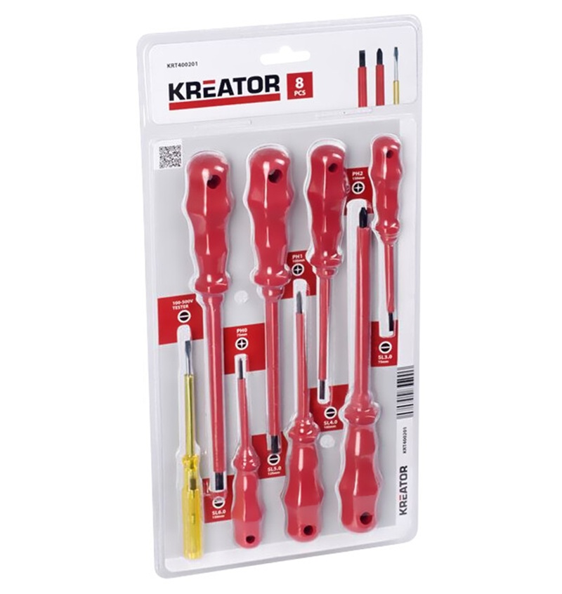 Kit destornilladores 8 piezas Plano(SL), Phillips (PH) y tester 110/250V con mango ergonómico aislado en color rojo.