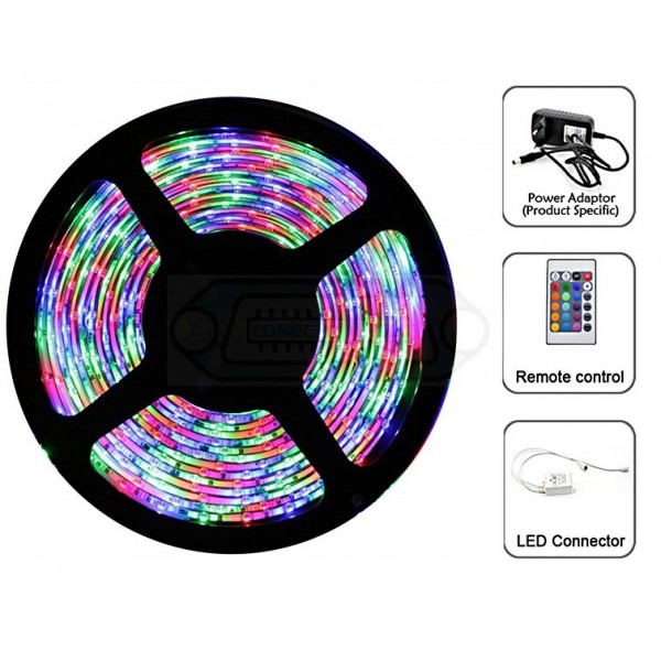 Tira de luces LED RGB, en rollos de 5 metros, autoadhesivas y flexibles para facilitar su colocación. Pueden cortarse en secciones de 3 LED para ajustarla en el lugar deseado. Su alta luminosidad las hacen visibles tanto de día como de noche. Ideal para la decoración de escaparates, stands de ferias, adornos navideños, discotecas, etc… Utilizar solo en interior. No utilizar reguladores de intensidad. Hasta 25.000h de vida. Entrada de corriente en la propia tira. Enchuhfar y listo.