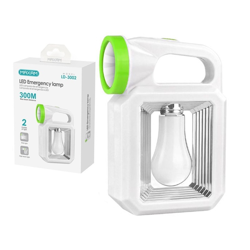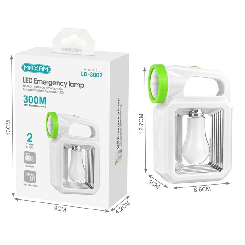 Lámpara LED de emergencia con 2 modos de luz (Faro + Luces laterales) alcance hasta 300 metros MAXAM LD-3002-WG alimentación con pilas 3x AA (no incluidas), acabado en color blanco.