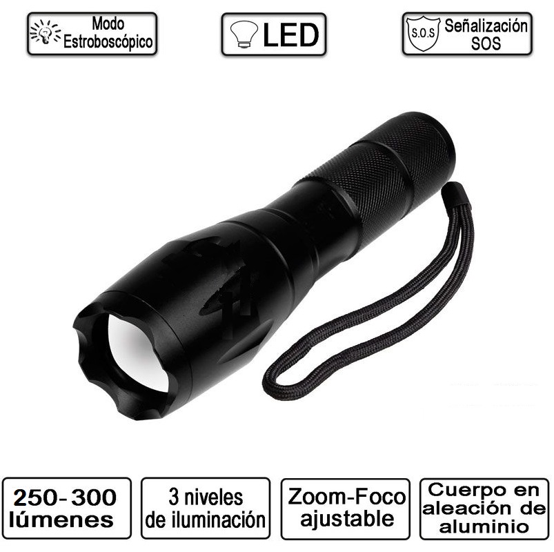 Linterna Led con zoom-foco ajustable 250Lm en aluminio negro con tres niveles de iluminación, modo estroboscópico y señalización SOS.