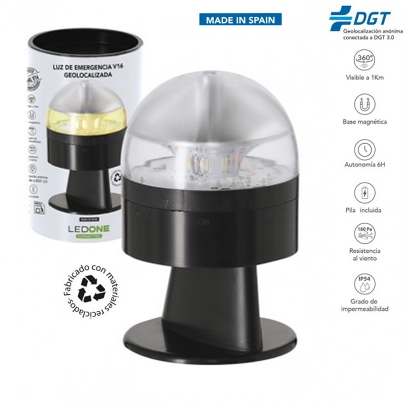 Luz de emergencia V16 Geolocalizada para automóviles fabricadas en España cumpliendo los requisitos de la DGT según la normativa de seguridad vigente y homologada por laboratorio acreditado LCOE.