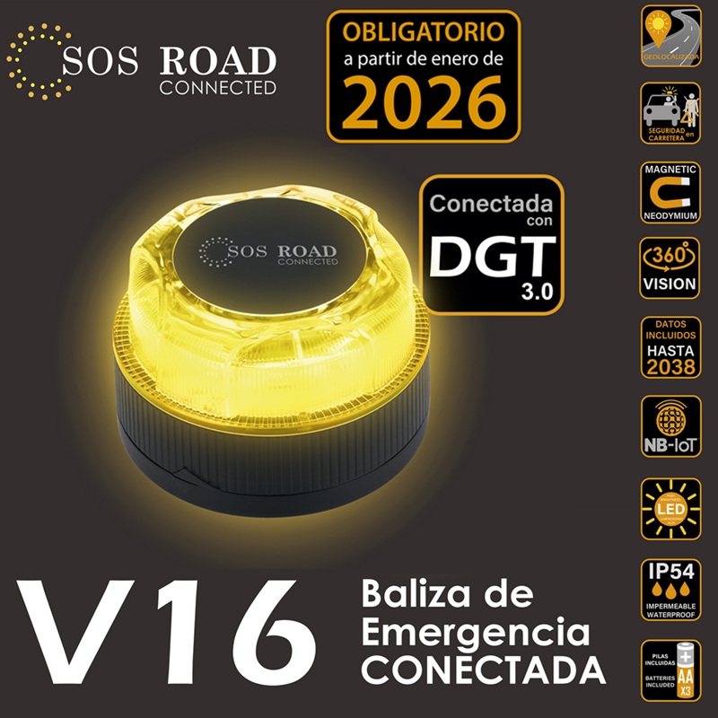 Baliza de Emergencia V16 con Geolocalización y Conexión DGT 3.0 SOS ROAD Connected, uso obligatorio en Enero 2026, Señal LED homologada para coche, alcance 1km, resistente al agua, datos Incluidos hasta 2038