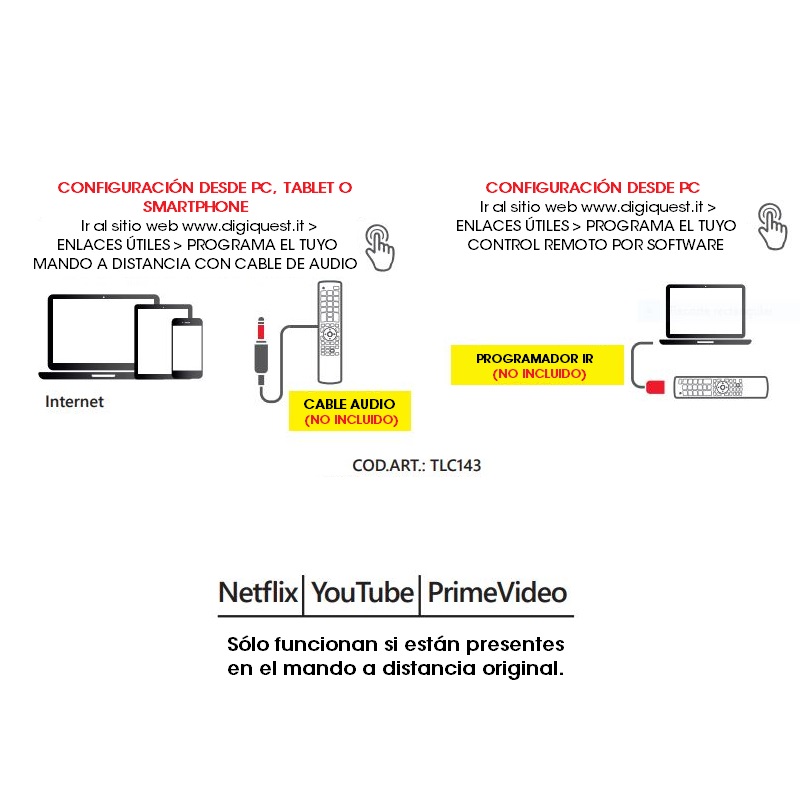 Mando a distancia universal Programable desde cualquier dispositivo con conexión a internet y salida de audio, mediante cable de audio o programador IR (no incluido).