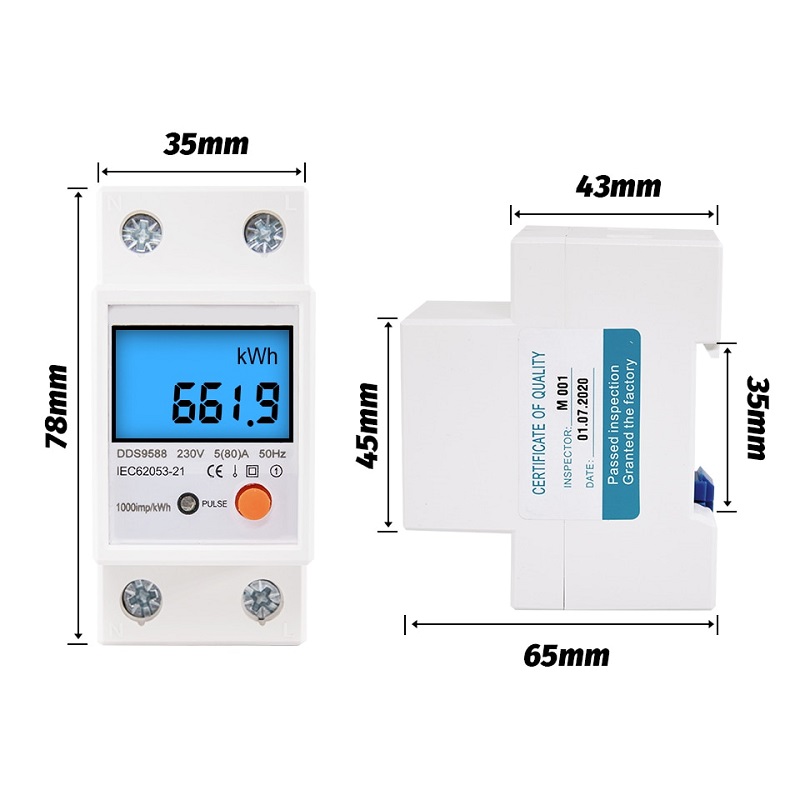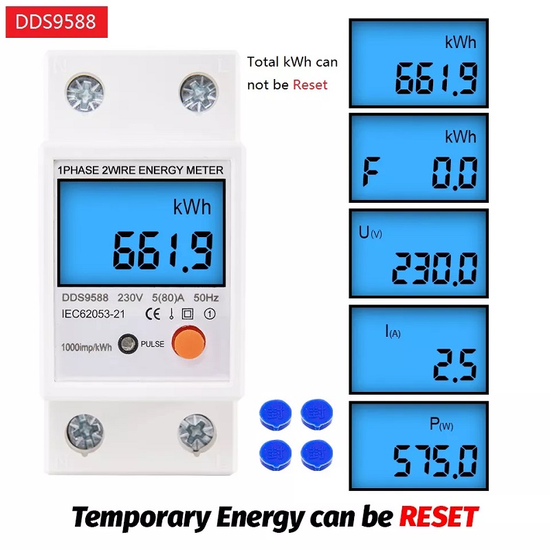 Pantalla LCD con luz de fondo LED indica Funcionamiento del medidor. Instalación de carril din de 35mm el medidor es una pantalla multifuncional de energía total kWh, energía temporal kWh, voltaje real, corriente real, potencia real por presión manual. El botón para6 segundosPara restablecer el kWh temporal