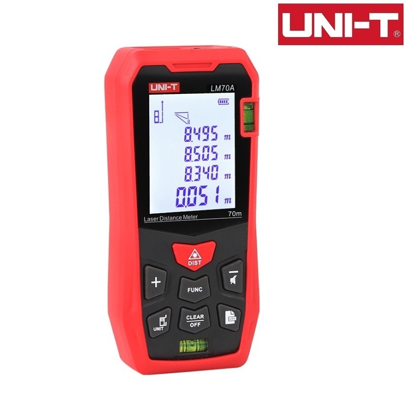 UNI-T LM100A Medidor láser de distancia 100 metros con pantalla LCD 2″ autocalibración, nivel, carcasa en color rojo/gris.
