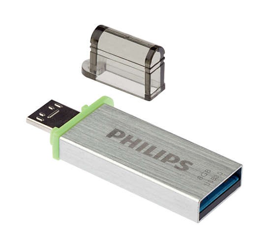 Unidad Flash USB 3.0 OTG de 8GB PHILIPS FM08DA132B/10 con conectores USB y micro USB para uso en ordenadores, smartphones y tabletas.